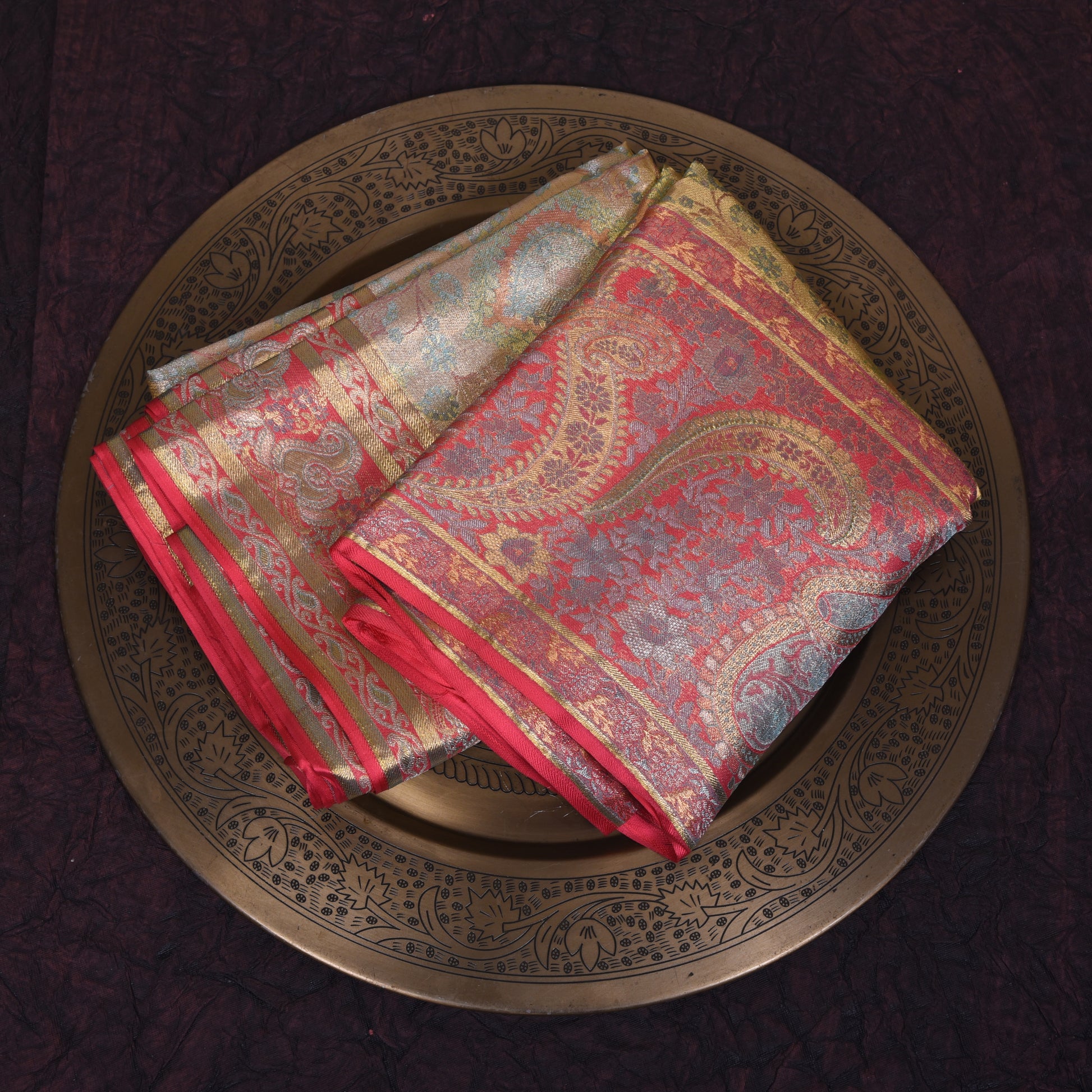 Embrace the essence of tradition with this pure silk Kanjivaram saree, featuring intricate floral motifs in vibrant red, complemented by luxurious gold and silver accents. The harmonious combination of bold red and shimmering metallic hues creates a stunning contrast, making this saree the perfect choice for weddings, festivals, and grand celebrations.