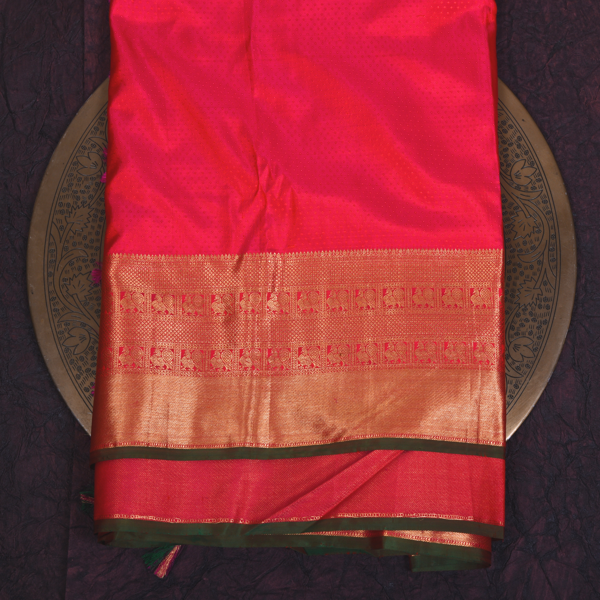 This exquisite rani Kanjivaram silk saree, highlighted with a shimmering gold border and intricate green accents, is a true embodiment of timeless elegance. A blend of tradition and luxury, it is perfect for making a statement at weddings or cultural celebrations.