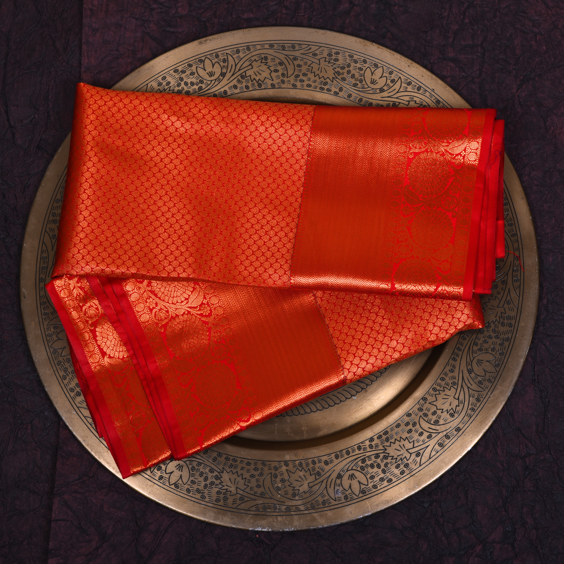 This Kanjivaram silk saree in a rich red base is beautifully accentuated with striking bright orange highlights. The bold contrast between the deep red and the vibrant orange adds a modern twist to this traditional masterpiece, making it perfect for weddings, festivals, or any grand occasion where you want to stand out in style.